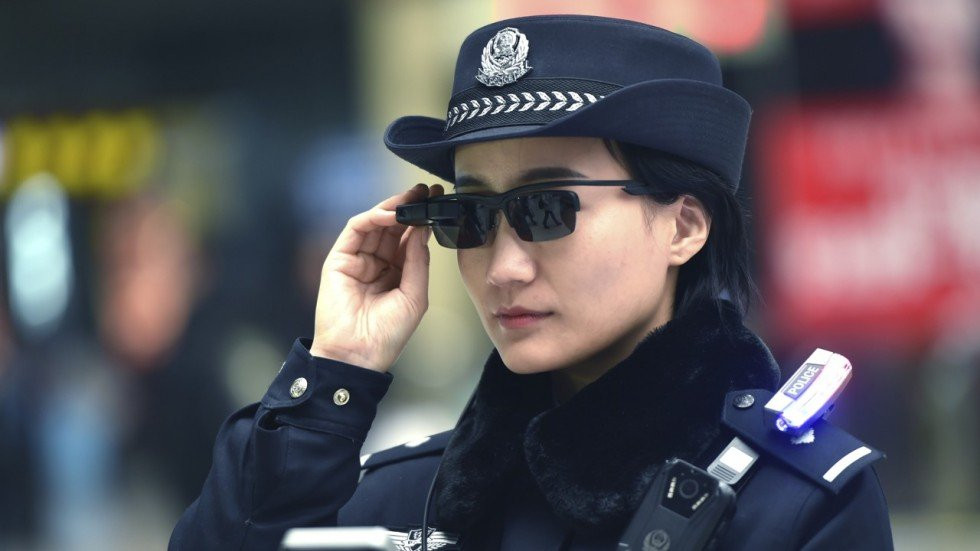 Một sỹ quan cảnh sát ở Hà Nam dùng kính để nhận diện tội phạm.