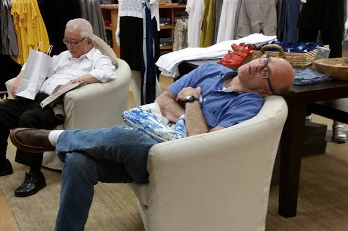 Đưa vợ đi mua sắm, chẳng qua cũng chỉ là đổi địa điểm ngủ từ phòng khách ở nhà sang "phòng khách" của trung tâm thương mại.