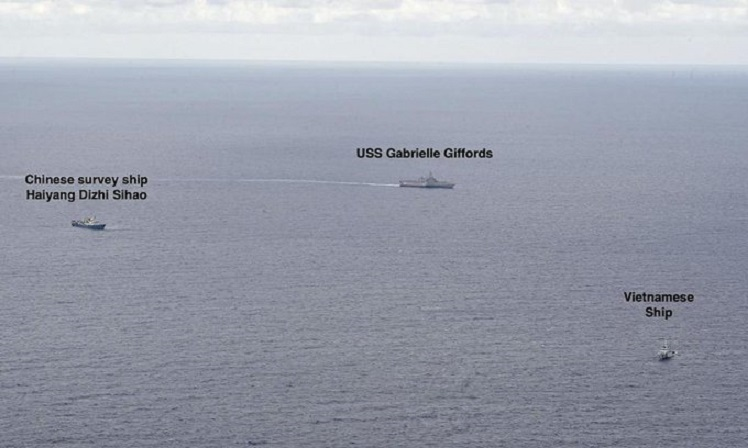 Trang Facebook của Hạm đội 7 của Hải quân Mỹ hôm 2/7 đăng tải loạt ảnh đáng chú ý về cuộc chạm mặt giữa tàu tác chiến ven bờ USS Gabrielle Giffords (LCS 10) của Mỹ, tàu kiểm ngư Việt Nam và tàu khảo sát Hải Dương 4 của Trung Quốc ở khu vực Biển Đông.
