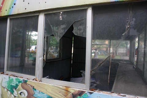 Cửa phòng bảo vệ đã bị đập bể kính cửa.