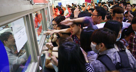 | Đến 17 giờ chiều, Hàng ngàn người vẫn đang xếp hàng để chờ mua vé |