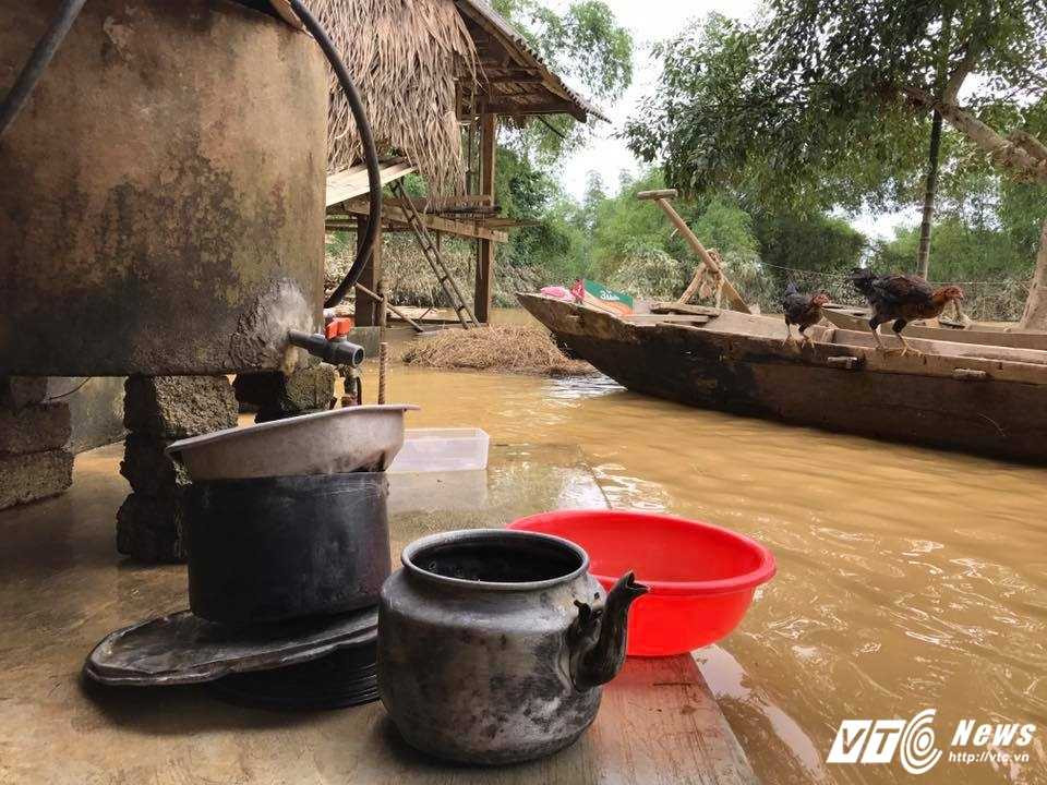Đàn lợn 5 con nhọc nhằn nuôi cả năm trời cũng cuốn theo cơn lũ dữ, chỉ còn chiếc chuồng trống trơn. Món tài sản đáng giá nhất, là mấy con gà may mắn sống sót sau đợt lũ, nước rút đến đâu, được đưa lên chỗ cao đến đó.