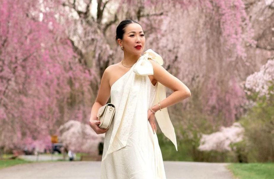 Váy lệch vai giúp thu hút sự chú ý vào phần vai và cổ, từ đó tạo cảm giác chiều cao lớn hơn.