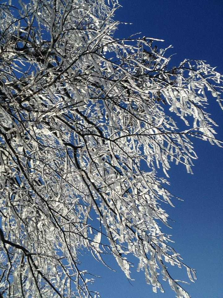 Những cành cây khẳng khiu phủ đầy băng tuyết trắng xóa. Ảnh: Mực tím