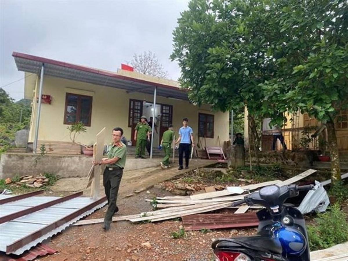 Lực lượng công an giúp đỡ người dân khắc phục hậu quả do gió lốc, mưa lớn gây ra ở xã Mã Ba, huyện Hà Quảng, tỉnh Cao Bằng. (Ảnh: TTXVN phát)