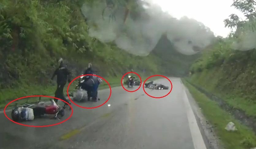 Hàng loạt xe máy nối đuôi nhau vượt xe tải khi đổ đèo giữa trời mưa to, ngã la liệt trước đầu ô tô gắn camera hành trình; tai nạn xảy ra vào chiều 4/9 trên đèo Cao Bắc, Cao Bằng.