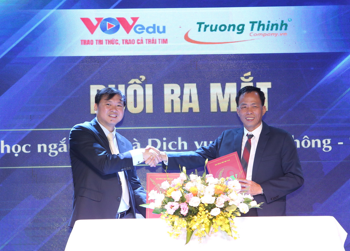 Ông Nguyễn Văn Hùng (trái), Phó hiệu trưởng phụ trách trường Cao đẳng Phát thanh - Truyền hình I ký kết hợp tác với ông Phạm Ngọc Trường (phải), Tổng giám đốc Công ty cổ phần Kỹ thuật và Công nghệ Trường Thịnh.