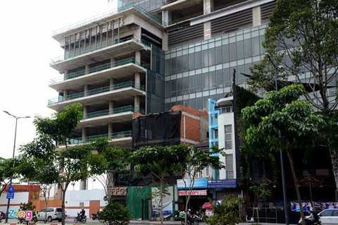 Saigon One Tower đã xây dựng gần xong, nhưng phía mặt đường Hàm Nghi vẫn còn gần chục căn nhà trên khu đất dự án chưa di dời. Hiện các hộ dân này vẫn được cho thuê kinh doanh, buôn bán tấp nập, mặc công trình sắt thép treo lơ lửng xung quanh.