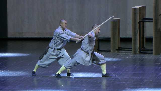 Những bài biểu diễn với gậy và đao kiếm đã thu hút được sự chú ý của khán giả đến xem các nhà sư Thiếu Lâm Tự trổ tài.