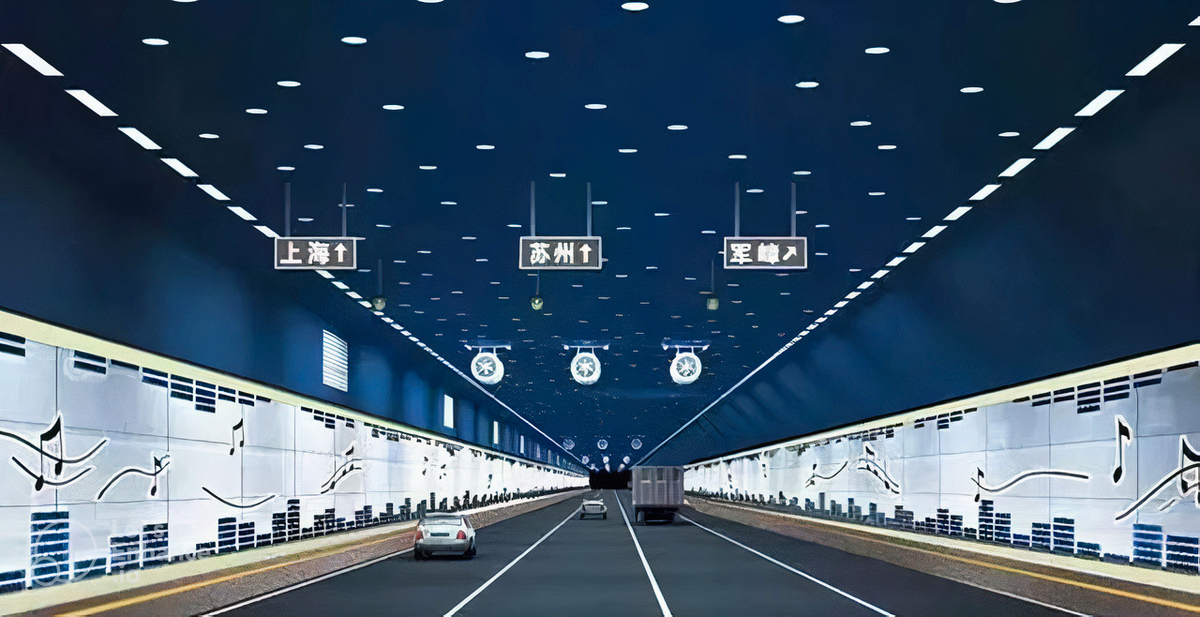 Trần của đường hầm lắp đèn LED màu, được thiết kế để giúp tài xế bớt mệt mỏi với nhiều hiệu ứng hình ảnh khác nhau.