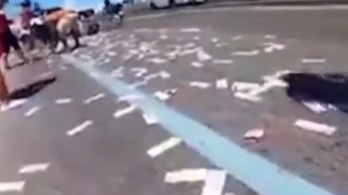 Chiếc balo đựng số tiền tương đương 1,2 tỷ đồng mà anh John Mark Barrientos (Philippines) đeo đằng sau đã xổ tung, bay khắp cao tốc, gây ra cảnh tượng hỗn loạn.