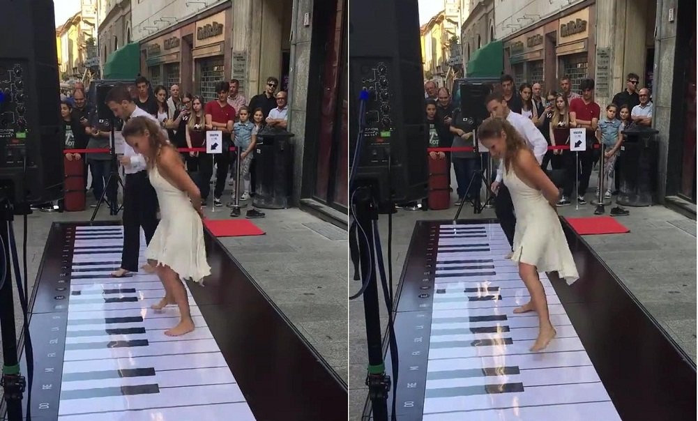 Cặp đôi nghệ sĩ đường phố người Ý mê hoặc khán giả bằng những bước nhảy uyển chuyển cùng bản hòa tấu êm ái trên phím piano khổng lồ.