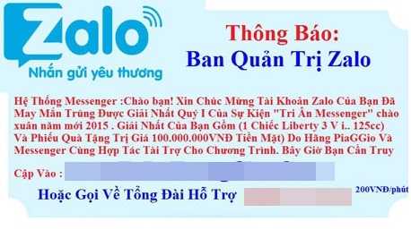 Trưa 8/3/2015, chị Ngọc (30 tuổi, ngụ quận 12 TP HCM) bất ngờ nhận được tin nhắn trúng thưởng. Thấy phần thưởng là chiếc xe tay ga hơn 60 triệu đồng và các quà tặng hàng chục triệu khác, chị bán tín bán nghi vào "trangchuzalo" xem, làm theo hướng dẫn của nhân viên chăm sóc khách hàng.