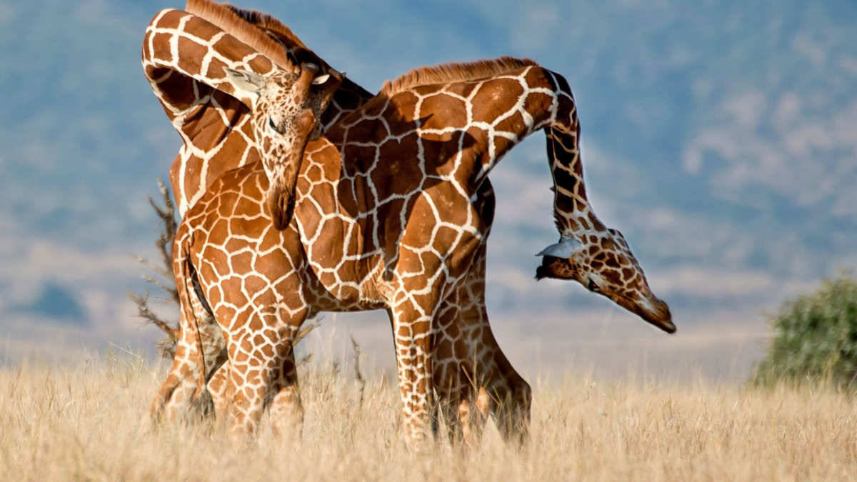 Trong bức ảnh, 2 con hươu dùng chiếc cổ cao của mình làm vũ khí để chọi nhau. Chúng có vẻ rất ăn thua, một mất một còn trong cuộc chiến này. Đầu của một con dường như bị bẻ cong về phía sau, trông rất đáng sợ.