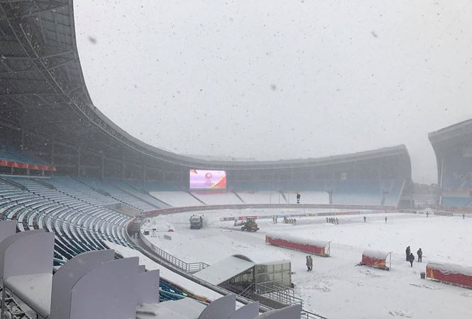 Tuy nhiên AFC không có thông báo hoãn trận đấu. Hai đội tuyển vẫn chuẩn bị ra sân và làm các thủ tục trước trận như lịch ấn định ban đầu. Ban tổ chức đang tiến hành cào bỏ lớp tuyết trên mặt sân (được phủ bạt để bảo vệ cỏ).