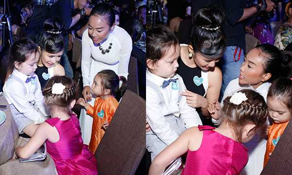 Cũng trong sự kiện, hai bé Tôm – Tép tỏ ra rất vui khi gặp bé Sol nhà Đoan Trang, nữ ca sỹ có biệt danh Sô cô la cùng chồng và con đến với đêm gây quỹ từ thiện, cô chủ động đưa bé Sol đến “ra mắt” Tôm – Tép và trò chuyện cùng Hồng Nhung.