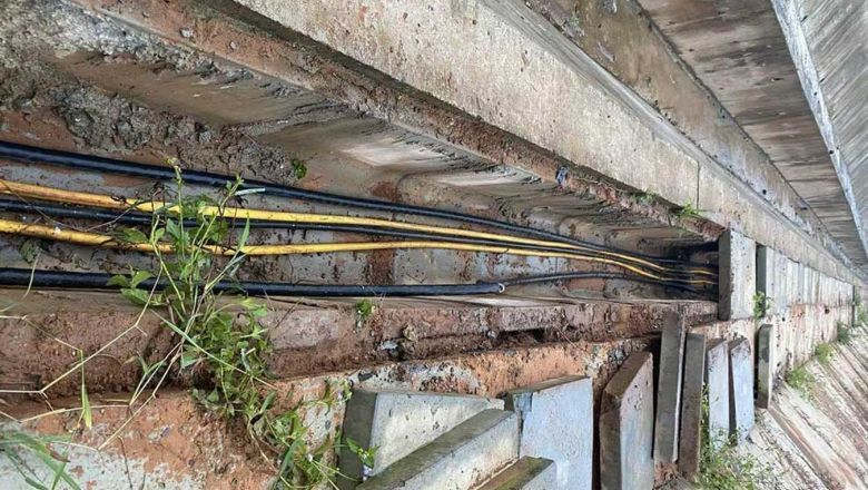 Hệ thống cáp điện dùng để cấp điện cho tuyến đường sắt Lào-Trung bị cắt trộm. (Ảnh: Vientiane Times)