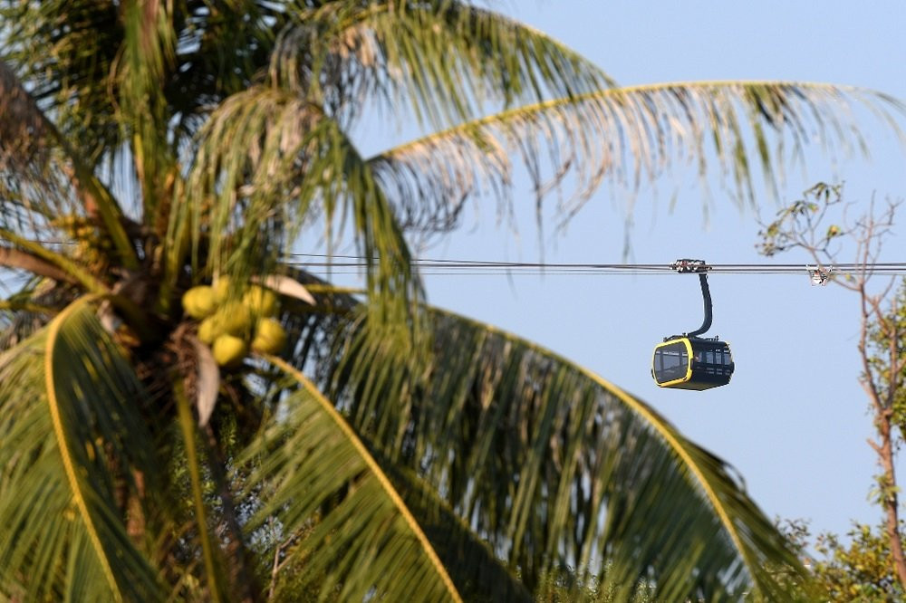 Khi cáp treo di chuyển qua vùng biển An Thới, du khách có dịp ngắm cả một “hạm đội” hàng trăm chiếc tàu, thuyền giương cờ tổ quốc ra khơi. Cáp treo băng qua các đảo Hòn Rỏi, Hòn Dừa, rừng xanh bạt ngàn thu trọn trong tầm mắt. Những bãi tắm cát trắng mịn như kem, cong cong hình vòng cung mềm mại tựa như chiếc gối bông êm ái đón từng đợt sóng gối bờ.