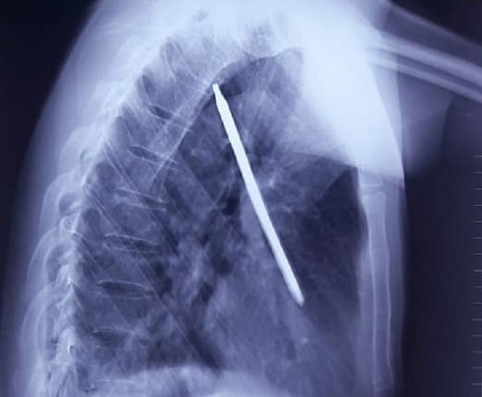Kết quả chụp X-quang cho thấy có dị vật trong lồng ngực. Bệnh nhân nhanh chóng được chuyển lên Khoa Ngoại tổng hợp để mổ cấp cứu, dẫn lưu màng phổi, lấy dị vật ra khỏi cơ thể.