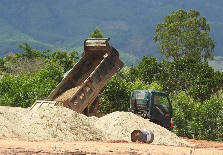Xe ben chở cát từ khu vực suối Cư San, huyện MDrak ra đường Đông Trường Sơn tập kết.