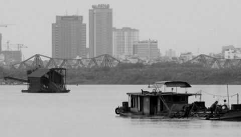 | Tàu hút cát hoạt động gần khu vực cầu Long Biên ngày 9/3. Ảnh: Minh Đức |