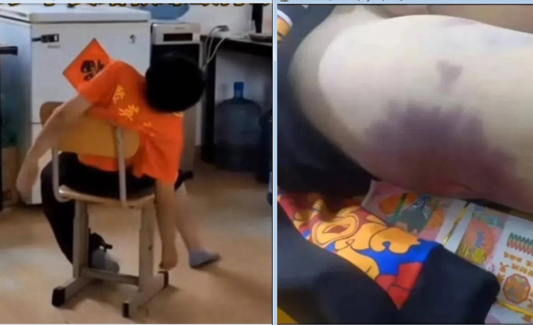 Sau khi liên tục chịu đòn, cậu bé ngồi xuống ghế rồi ngã xuống đất, bất tỉnh.