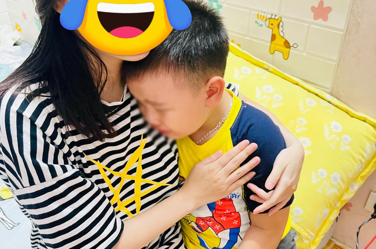 Người mẹ ra sức dỗ dành cậu con trai đang khóc mãi không dừng.