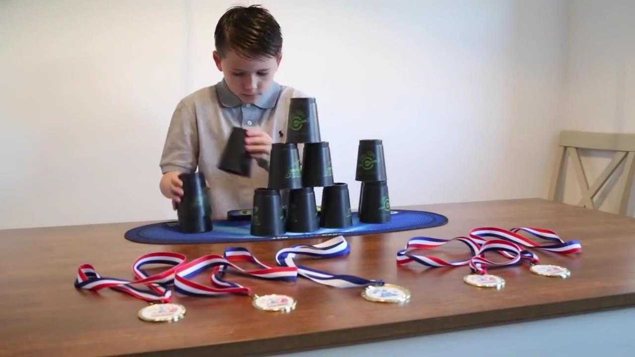 Chỉ trong chớp mắt cậu bé Ciaran Brown, 10 tuổi, đến từ Cambridgeshire, Anh có thể xếp những chiếc cốc chồng sole nhau và thu về nhanh chóng