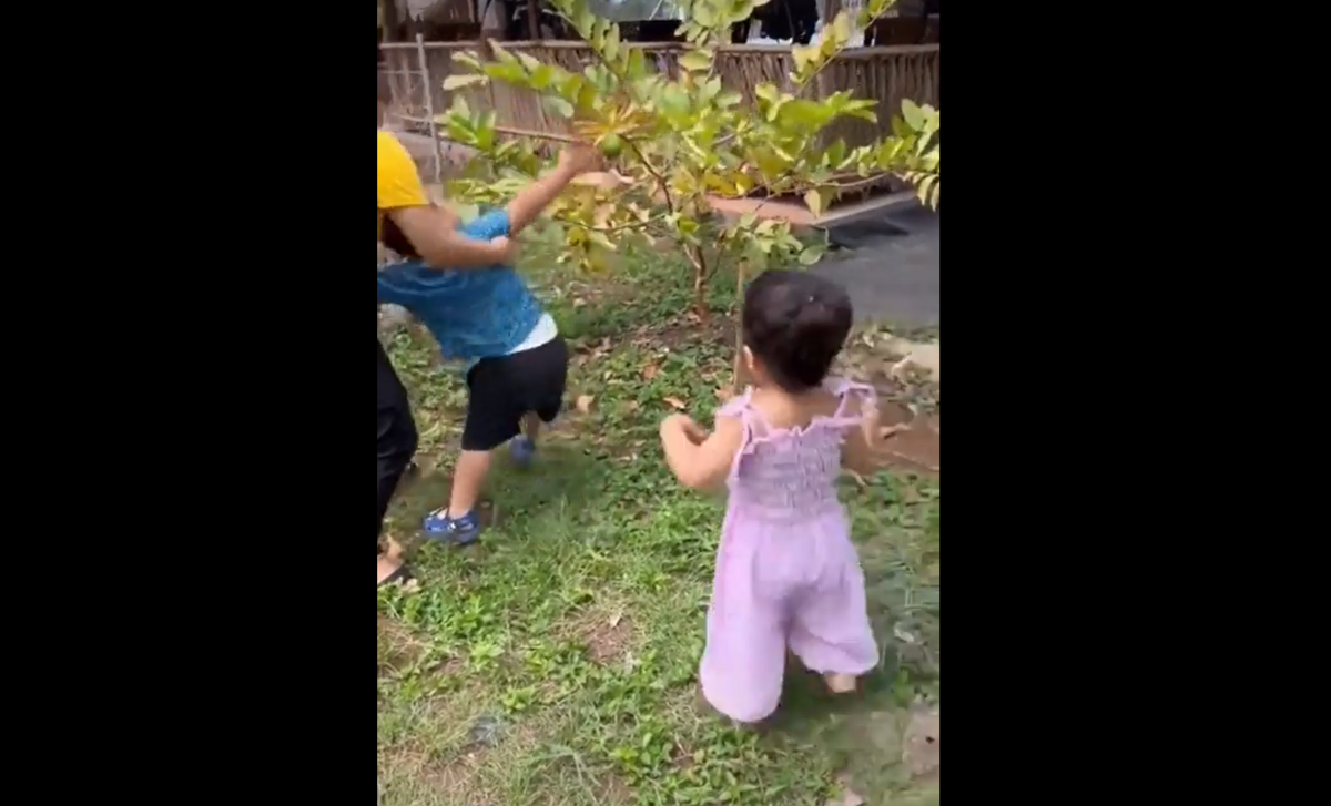 Tuy còn mặc tã nhưng cậu bé đã cực kỳ ga lăng, nhất định tranh "suất" hái ổi tặng bạn gái.