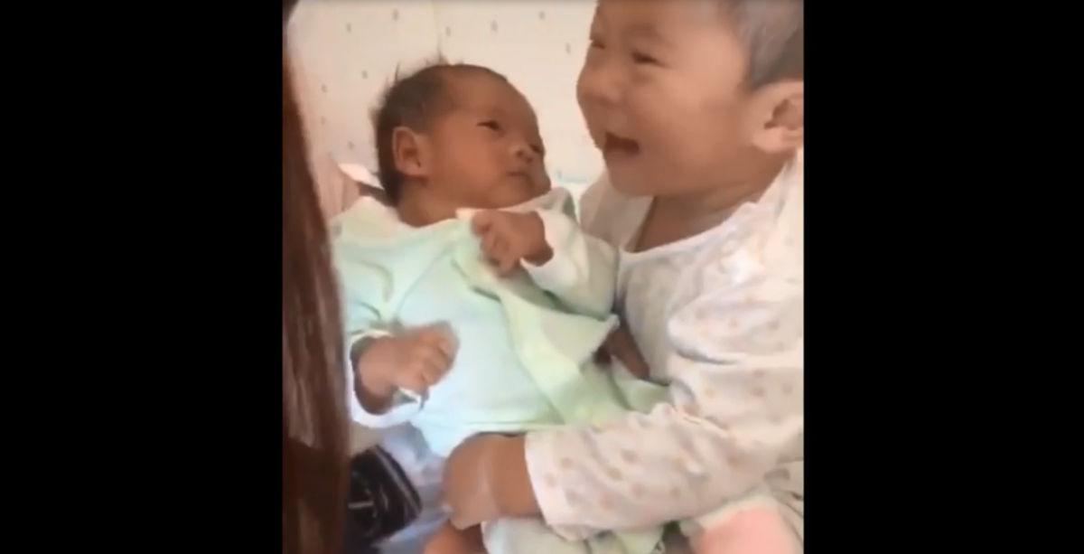 Nụ cười sung sướng của cậu bé khi mẹ cho bế đứa em mới sinh quả là đáng yêu không chịu nổi.