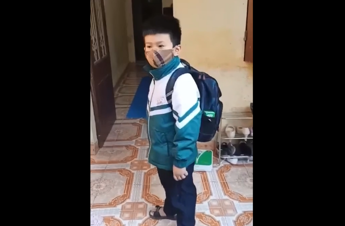 Cậu bé đeo cặp trên vai nhưng khi bố hỏi thì lúng túng rồi hùng hục đi tìm.