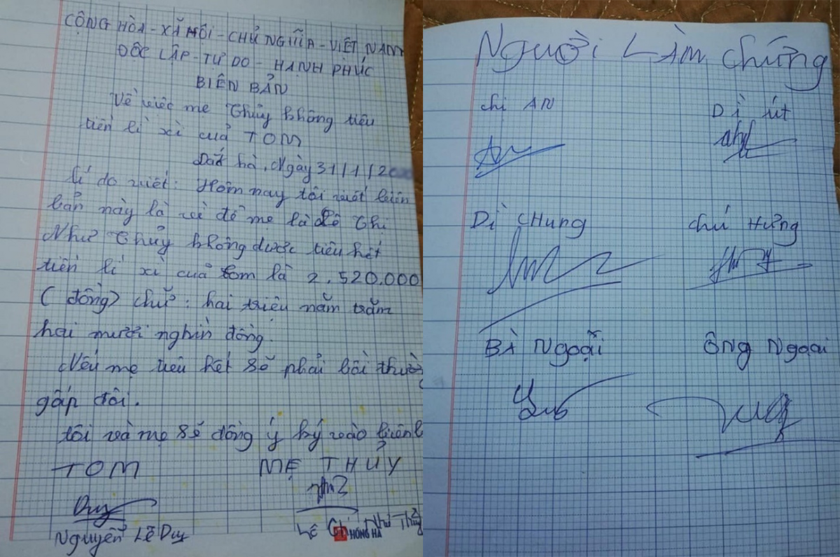 Cũng bởi vậy, một cậu bé đã khiến dân mạng được phen cười ngặt nghẽo khi "chắc cú" làm hẳn một biên bản cam kết mẹ không được tiêu tiền lì xì của mình. Nếu không, mẹ sẽ phải... đền gấp đôi số tiền lì xì đang có. Không những thế, cậu bé còn cẩn thận bảo mẹ ký vào biên bản và cả những người họ hàng trong gia đình đứng ra... làm chứng.