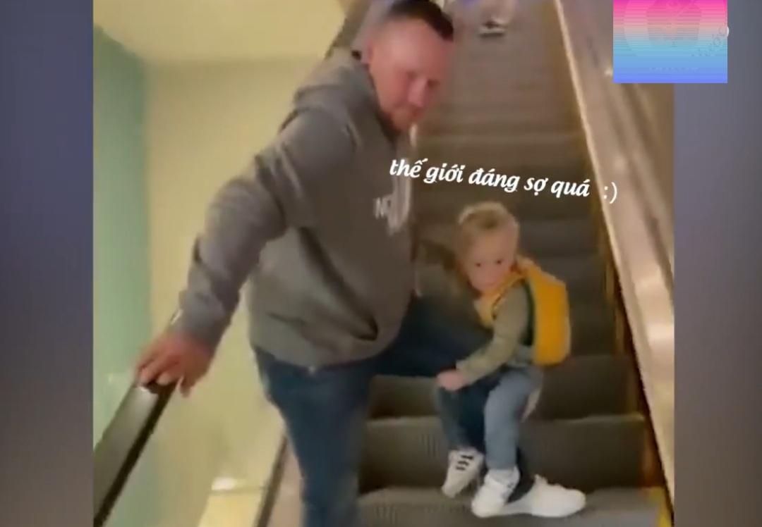 Cậu bé đu lên bám chặt đùi bố khi đi thang cuốn
