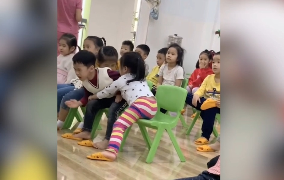 Cậu bé giận dữ vì bị 2 bé gái tranh nhau ôm