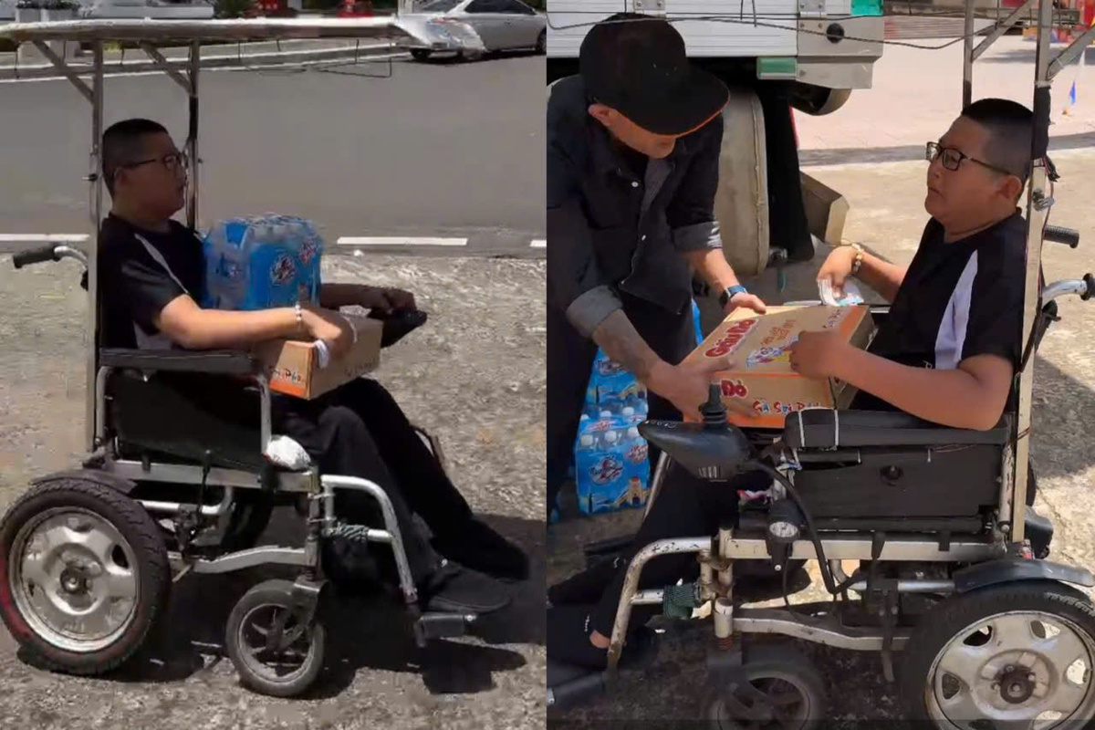 Trong hàng ngàn người đến ủng hộ, có một bé trai ngồi xe lăn, tay cầm xấp vé số đem nước lọc, thùng mì tôm với mong muốn nhờ chuyến xe 0 đồng gửi đến bà con vùng lũ.