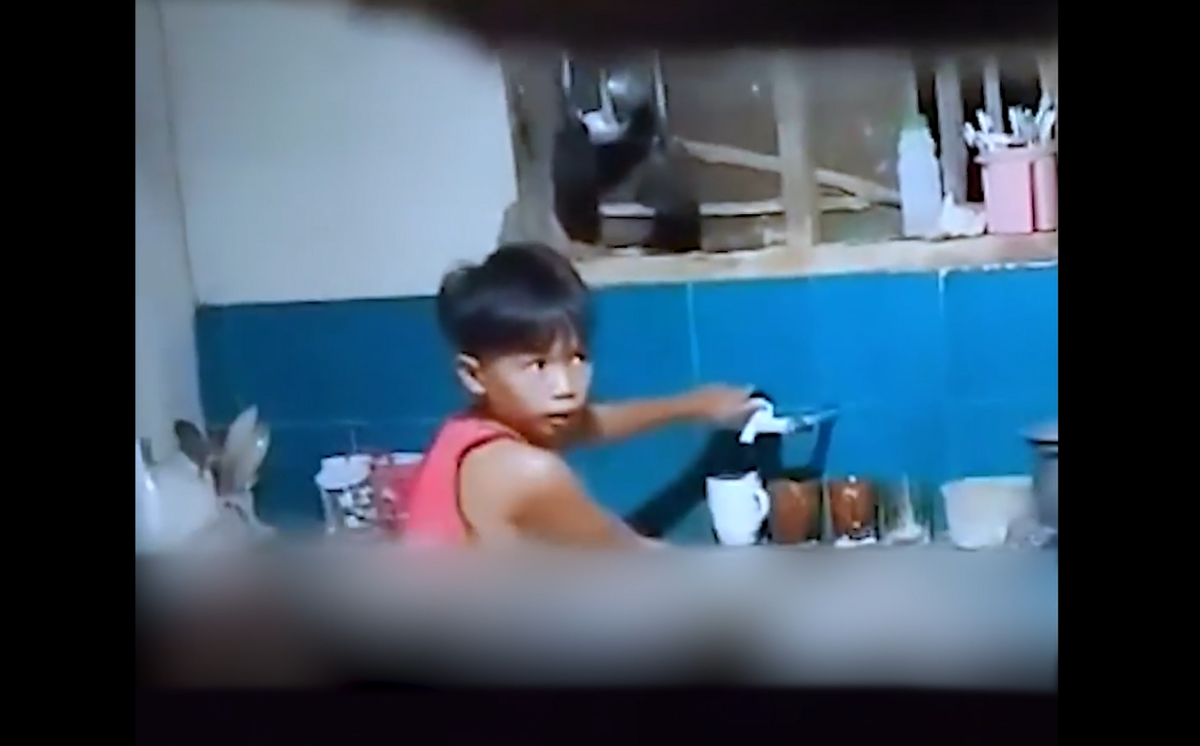 Đang cặm cụi rửa bát thì nghe tiếng động lạ, cậu bé sợ hãi cố gắng làm thật nhanh, nhưng không kịp...