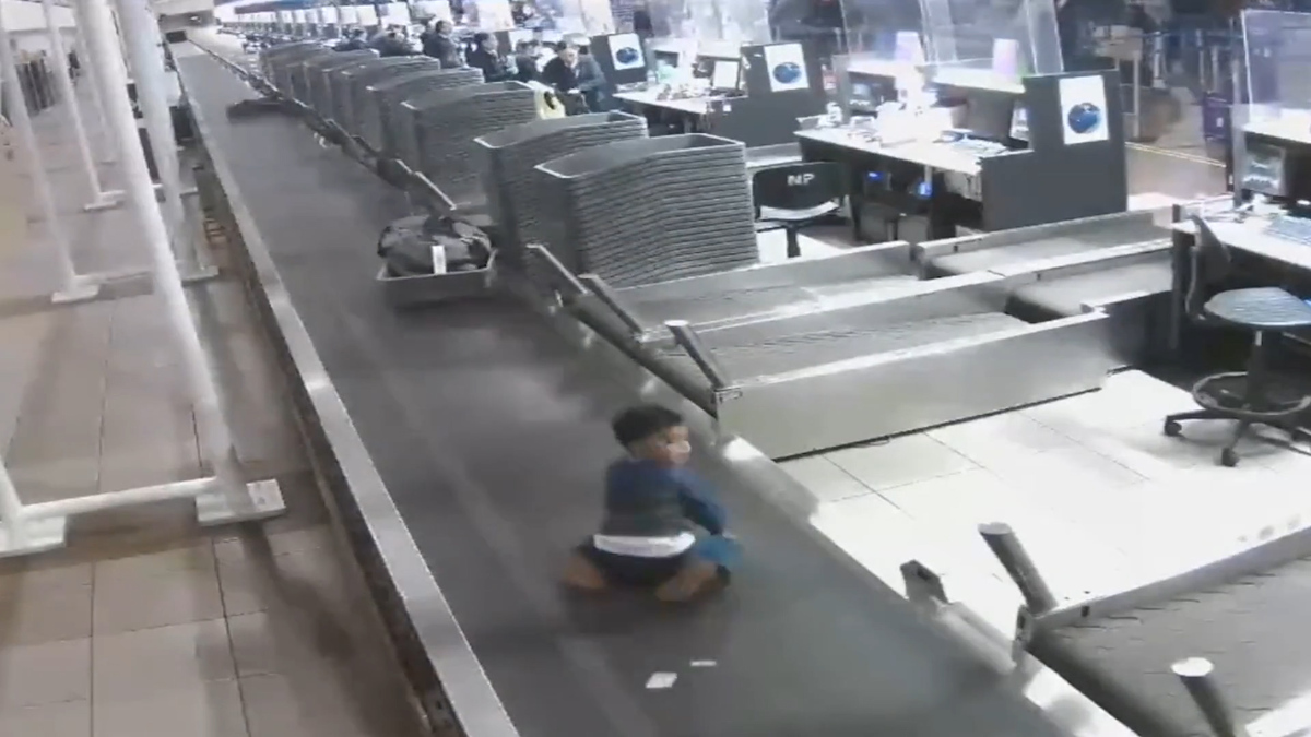 Lẻn qua quầy làm thủ tục, cậu bé 3 tuổi tinh nghịch bước lên băng chuyền và “du ngoạn” khu hành lý tại sân bay Arturo Merino Benítez, Santiago, Chile.