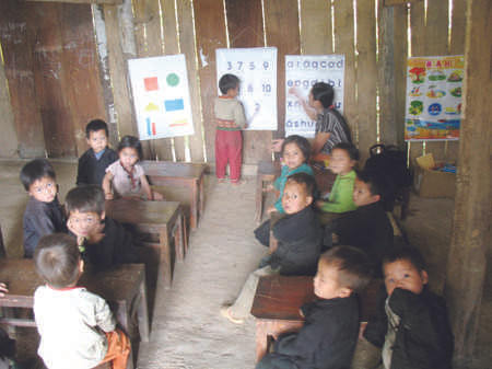 - “Nó học giỏi nhất ở đây đấy, mình nó lớp bốn thôi”, chỉ vào một bé gái trùm chiếc khăn xanh đã bạc màu, bé trai đội chiếc mũ nồi đen lỗ chỗ mấy lỗ thủng vừa cười vừa nói.