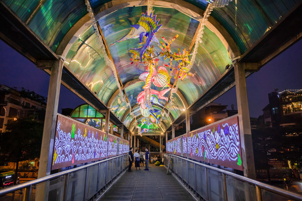 Tận dụng ánh sáng từ đèn cao áp chiếu hắt xuống đi qua tấm che của cây cầu, những tác phẩm hiện lên trông như đường "hầm thủy cung" trên cạn với rất nhiều loài động vật biển đang bơi lội trên vòm cầu.