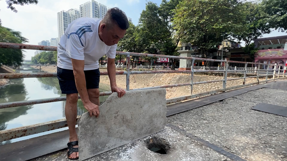 Cây cầu đi bộ trên đoạn đường Kim Ngưu, phường Vĩnh Tuy (Hai Bà Trưng, Hà Nội) xuống cấp nghiêm trọng, người dân phải dùng tấm ván để che những chỗ thủng.
