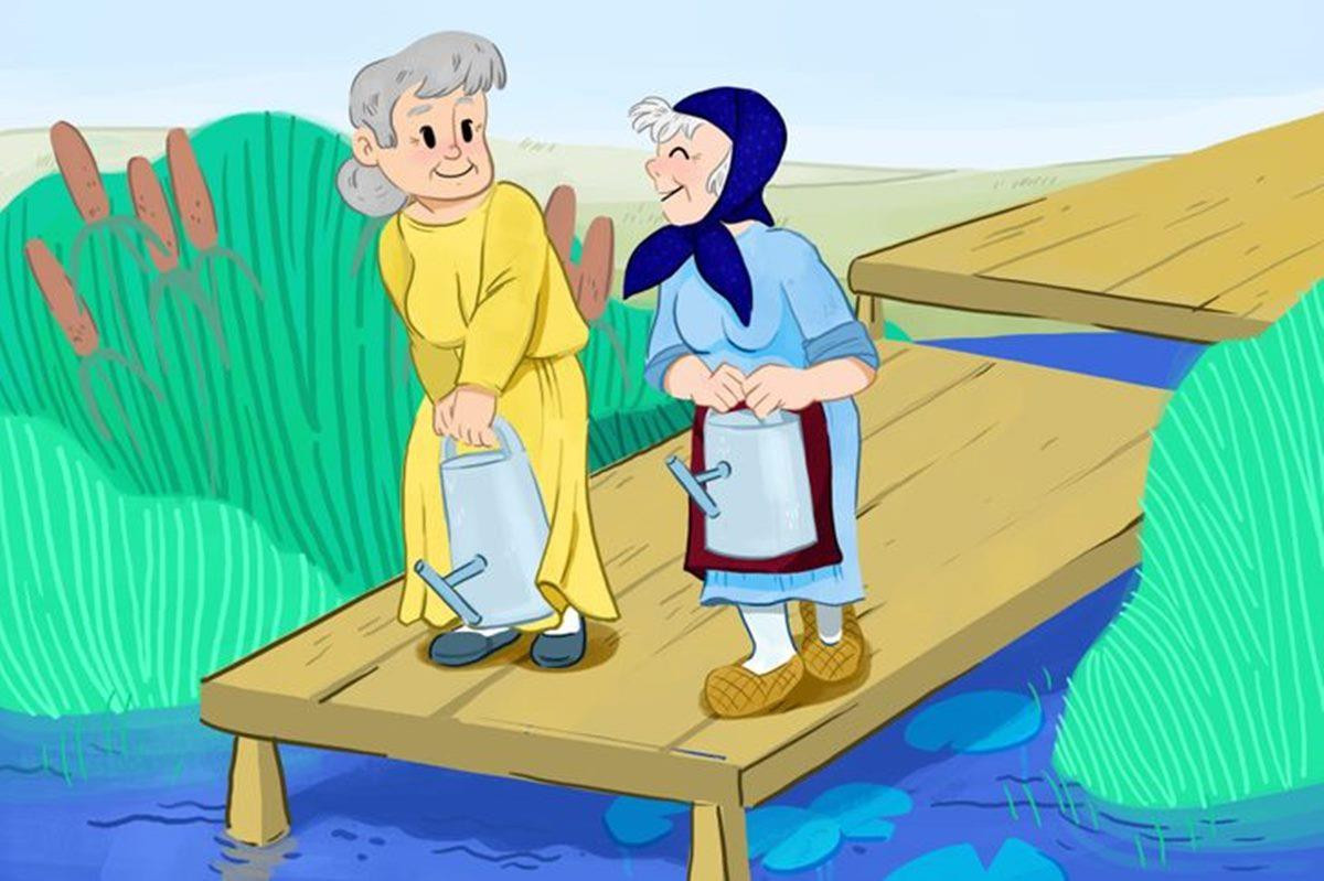 Hai cụ bà cùng đi đến bờ sông múc nước về tưới cây. Hỏi ai sẽ lấy được nhiều nước hơn?