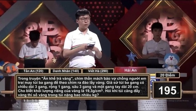Trong trận thi tuần, Đường lên đỉnh Olympia năm thứ 20, thí sinh Hải An nhận được câu hỏi 20 điểm phần thi Về đích với nội dung như sau: "Trong truyện "Ăn khế trả vàng", chim thần mách bảo vợ chồng người em trai may túi ba gang để theo chim ra đảo lấy vàng. Giả sử túi ba gang có chiều dài 3 gang, rộng 1 gang, sâu 3 gang và một gang tay dài 20cm. Cho biết khối lượng riêng của vàng là 19,3g/cm3. Hỏi khi túi căng đầy vàng thì số vàng trong túi nặng bao nhiêu kg?".