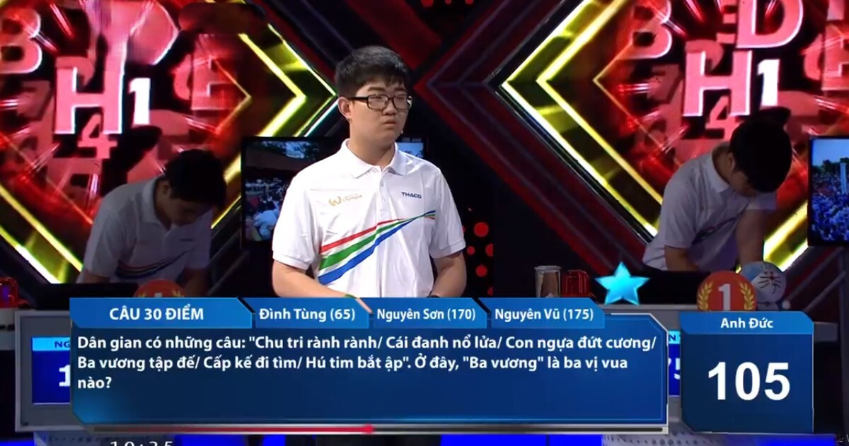 Câu đố trích dẫn những câu vè dân gian: “Chu tri rành rành / Cái danh nỏ lửa / Con ngựa đứt cương / Ba vương tập đế / Cấp kẻ đi tìm / Hú tim bắt ấp” và yêu cầu người chơi xác định “Ba vương” là ba vị vua nào. Nghe qua có vẻ như những câu rời rạc, nhưng thực chất mỗi chi tiết đều ẩn chứa manh mối lịch sử và văn hóa.