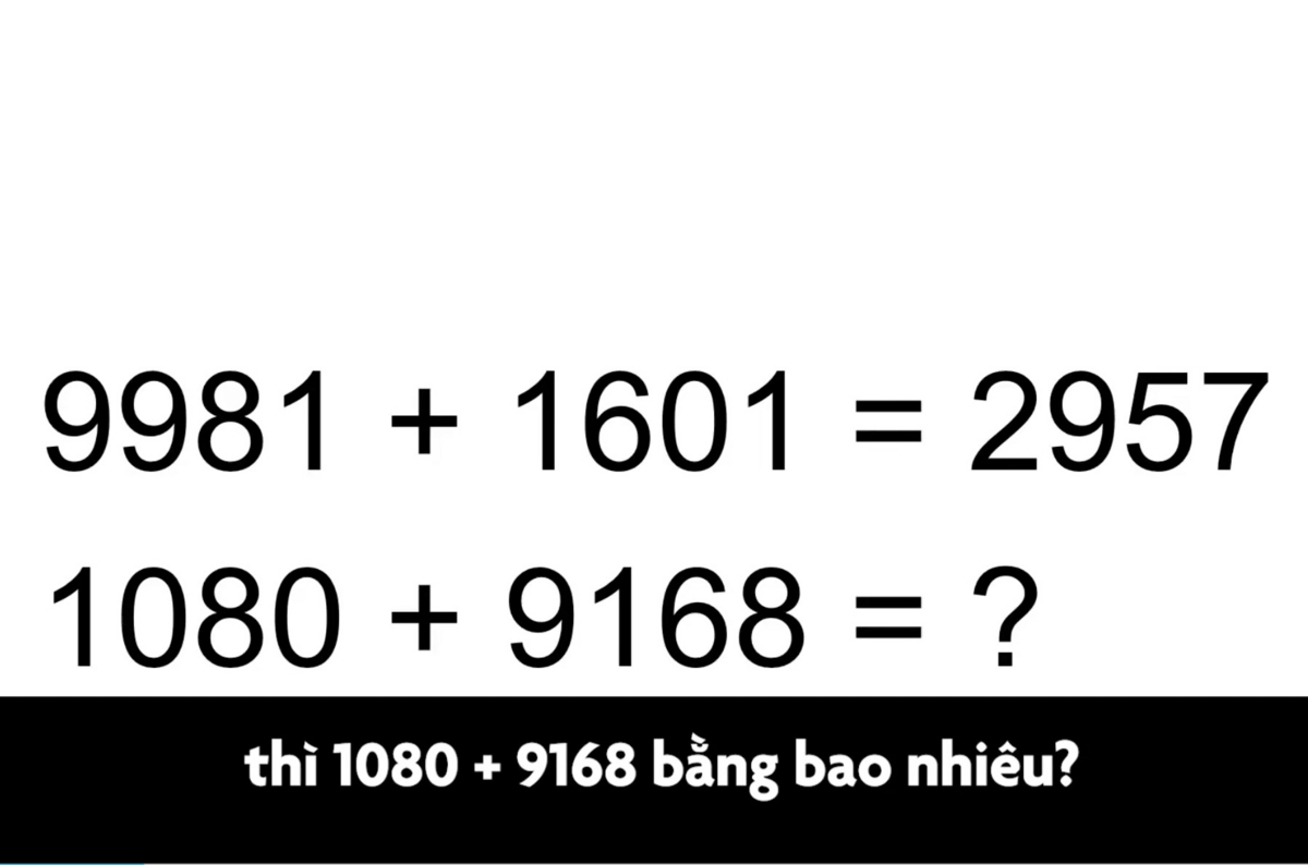 Câu đố hại não: Nếu 9981 + 1601 = 2957 thì 1080 + 9168 bằng bao nhiêu?