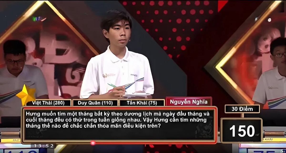 Trong cuộc thi Đường lên đỉnh Olympia, câu hỏi trị giá 30 điểm trong phần thi về đích làm khó thí sinh Nguyễn Nghĩa với nội dung như sau: "Hưng muốn tìm một tháng bất kỳ theo dương lịch mà ngày đầu tháng và cuối tháng đều có thứ trong tuần giống nhau. Vậy Hưng cần tìm những tháng thế nào để chắc chắn thỏa mãn điều kiện trên?".