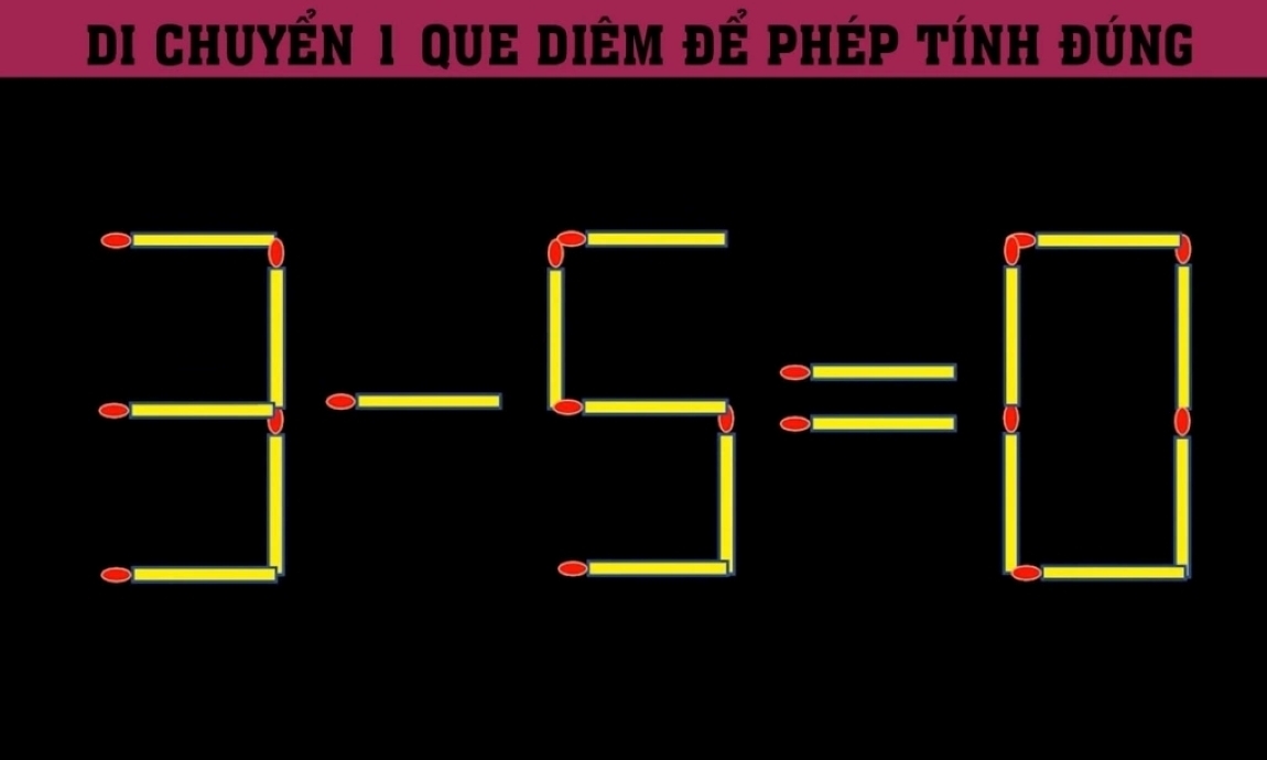 Nhìn vào phép tính "3 - 5 = 0" ai cũng biết là sai. Nhiệm vụ của bạn hãy di chuyển 1 que diêm để biến phép tính này trở nên chuẩn chỉnh. Ai giải được thì đúng chuẩn "best của lớp toán ngày xưa".