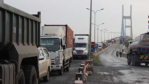 | Dòng xe tải kéo dài trên cầu Phú Mỹ - Ảnh: Mậu Trường |