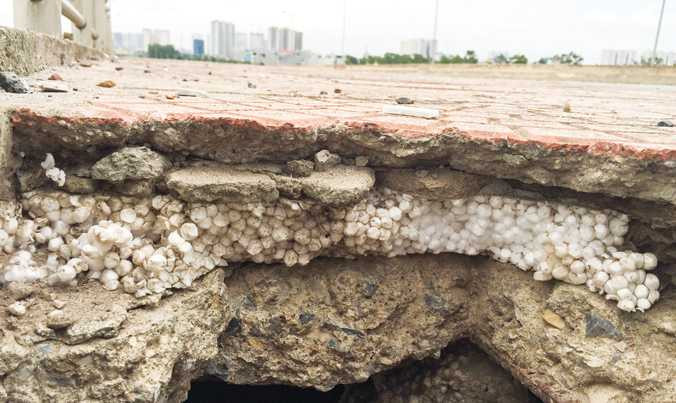 Theo ghi nhận của PV, móng nhiều trụ cột đèn chiếu sáng trên cây cầu này lộ những tấm xốp trắng. Lớp xốp dày 3-4 cm xen kẽ giữa lớp cát đệm và bê tông trên vỉa hè cầu. Chỉ cần dùng tay có thể bẻ gãy các miếng xốp giữa bê tông và cát rụng rời, vỡ vụn.