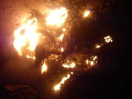 | Chiếc xe máy của cẩu tặc bị người dân đốt cháy |