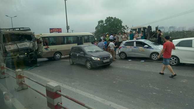 Vụ tai nạn xảy ra lúc 8h15 ngày 8/5, trên cầu Thanh Trì (Hà Nội) khi chiếc xe tải chở vật liệu xây dựng lưu thông nhanh trên đường dẫn lên cầu tông trúng đuôi xe khách 29 chỗ.